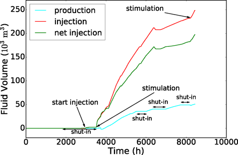 Cumulative injection, production, shut-ins, and stimulations. The widening gap between injection and production shows how much fluid is retained in the subsurface.