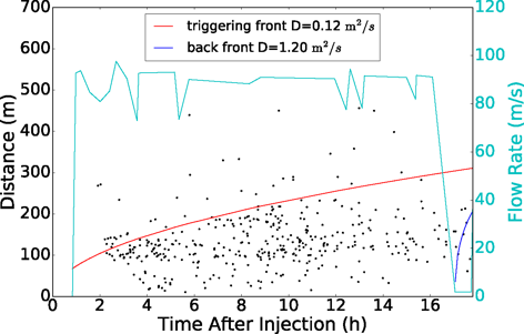 Distances of individual events from the injection point (dots) compared with a reference curve behaving like r ∝ t1/2. Early and late deviations from this smooth envelope hint at heterogeneous, evolving permeability rather than simple, uniform diffusion.