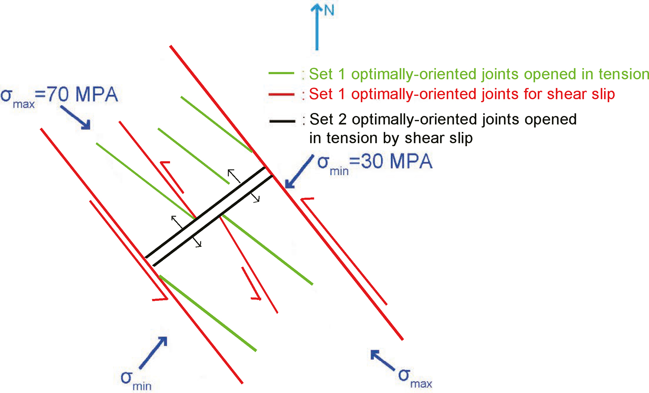 Schematic view of the fracture network at Rosemanowes. Red lines indicate shear slip on NW–SE‑striking Set 1 joints, optimally oriented in the present‑day stress field (σmax ≈ σH). Green segments represent tensile fractures opening parallel to σmax, often at intersections where shear on Set 1 pulls apart NE–SW‑striking Set 2 joints (black). This coupled shear‑and‑opening process creates vertically connected fluid pathways, explains the strong vertical permeability and anisotropic diffusion inferred from the seismic cloud, and accounts for why only a tiny fraction of the total deformation is radiated seismically.