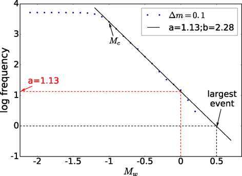 The frequency–magnitude curve is steep (b ≈ 2.3), meaning many tiny events and very few larger ones – a statistical fingerprint of low stress concentration on the largest fractures.