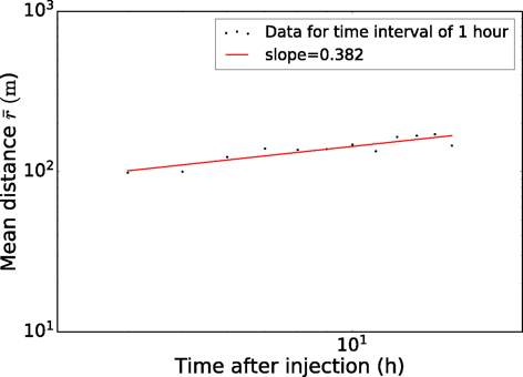The mean distance of events grows roughly as r ∝ t0.382, significantly slower than the 1/2 exponent expected for classical diffusion – consistent with anisotropic channeling of flow through a fracture network dominated by vertical pathways.