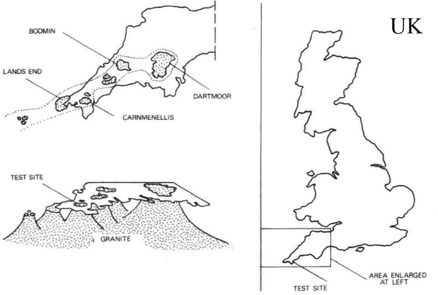 The Carnmenellis granite is part of the Cornubian batholith, a chain of granitic bodies stretching from Dartmoor in Devon all the way to the Isles of Scilly (Exley & Stone, 1964; Searle et al., 2024). Gravity surveys indicate that the granite beneath Rosemanowes extends to at least 10 km depth (Bott et al., 1958), forming a thick, relatively homogeneous block of low‑porosity, low‑permeability rock. Thermal measurements showed a favourable geothermal gradient: at depths of 2–3 km the rock temperature exceeds 80–100 °C, warm enough to be interesting for heat extraction but still technically drillable with conventional rigs for the time.