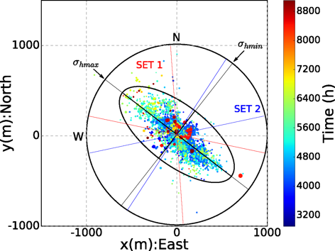 The induced events fill an elongated ellipse whose long axis aligns with the maximum horizontal stress and with the dominant joint set. Only a few outliers lie beyond the envelope, hinting at possible fluid channels or particularly sensitive patches.