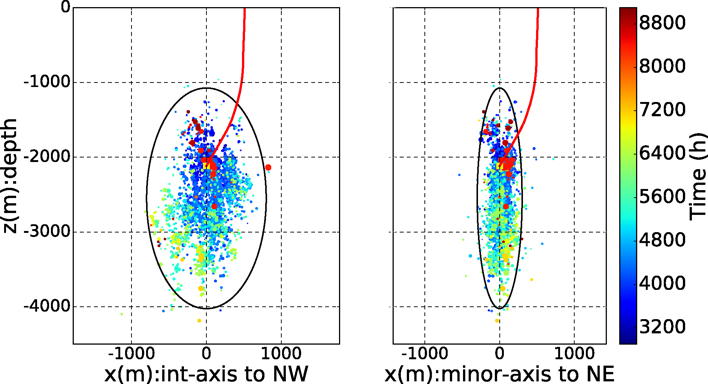 So far we have treated the microearthquake cloud mainly as a set of distances from the injection well. But the shape of that cloud in three dimensions, and how it relates to the fractures and stresses in the rock, is just as revealing. When we plot the epicentres in map view, colour‑coded by time, they fill out an elongated ellipse around the injection point. Most events sit neatly inside this envelope; only a few outliers to the northwest poke beyond it, perhaps hinting at local channels or patches that were already close to failure before injection began. In cross‑section, the picture becomes even clearer: the microseismicity forms a vertically stretched ellipsoid, much taller than it is wide. This echoes what we saw in the flow analysis – the reservoir is far from isotropic, and vertical connectivity is especially strong.