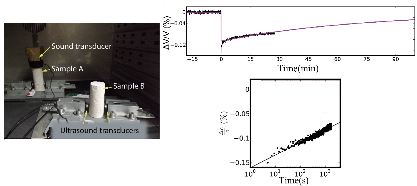 (Left) Experimental setup to monitor seismic velocity during and after a resonance experiment. (Right) After strong shaking (“conditioning”), the seismic velocity in gypsum recovers slowly, following an seemingly logarithmic trend with time rather than a simple exponential. Adapted from Gassenmeier (2015).