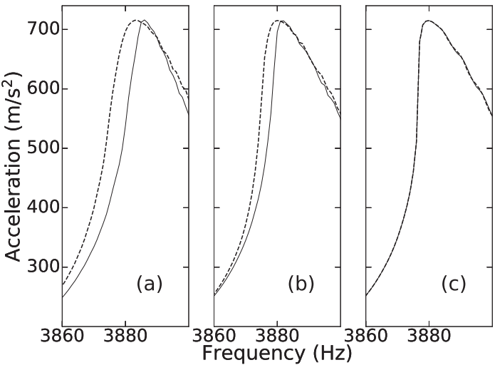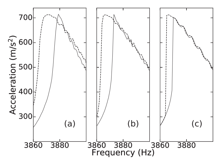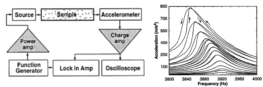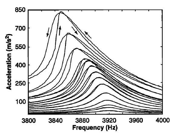 - Amplitude-dependent resonance shifts and asymmetric peaks: the resonance “leans” because stiffness evolves most strongly near resonance, so the natural frequency drifts during the sweep.