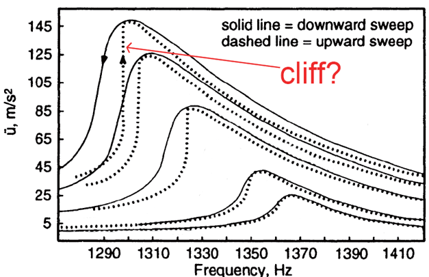 At high drive, rocks can show jump-like features in frequency sweeps—an experimental “cliff”.