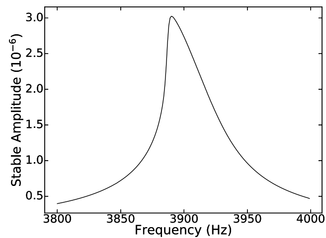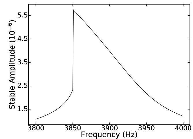 Technically, this is the same qualitative mechanism behind Duffing “jump” phenomena: strong nonlinearity can make the response curve fold over; increasing nonlinearity further produces multiple steady solutions, where the middle branch is unstable. In the thermodynamic model, the feedback loop (large vibration $ \rightarrow $ more contact opening $ \rightarrow $ softer modulus $ \rightarrow $ shifted resonance) provides the nonlinearity needed to create that fold and bifurcation.