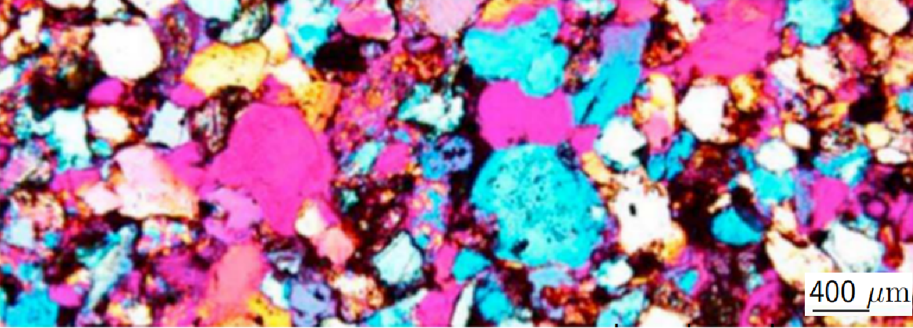 Each grain touches its neighbours at tiny, fragile contacts – the source of much of the rock’s nonlinear behaviour. Field of view: 3.1 mm. Adapted from Rivière et al. (2015b).