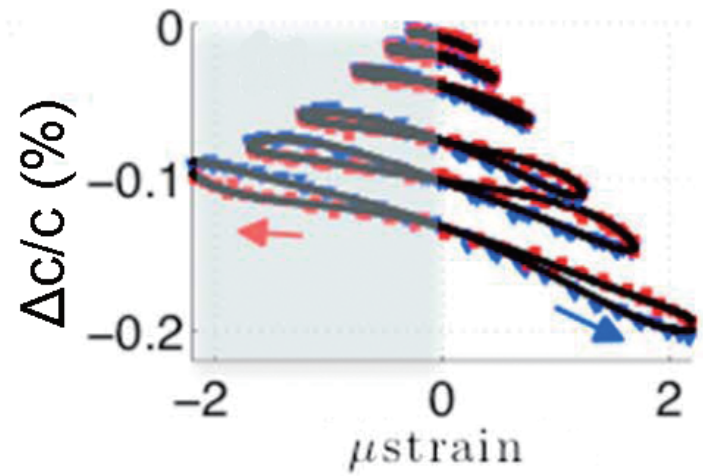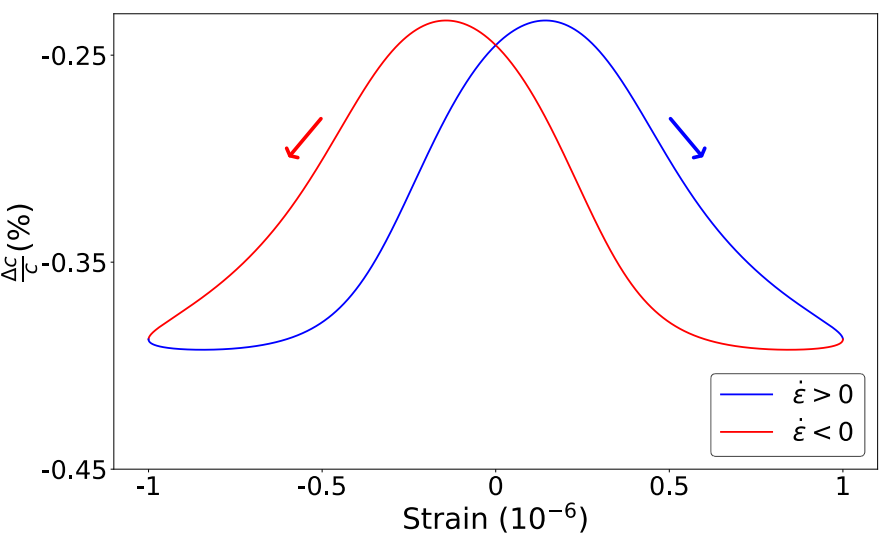 DAET measurements show the same signature: wave speed (and inferred stiffness) traces a loop rather than a single curve, indicating fast nonlinear hysteresis. Adapted from Rivière et al. (2015b).