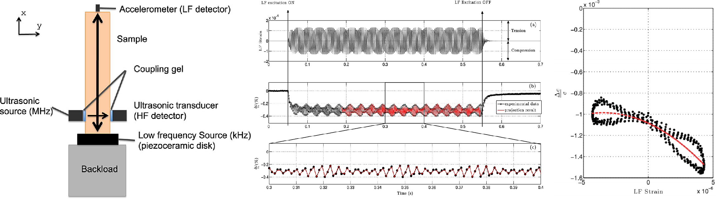 Resonance sweeps are one way to reveal nonlinearity. Another is to keep the frequency fixed and simply cycle the strain up and down, the way DAET does: a low-frequency “pump” gently stretches and compresses the sample, while a high-frequency ultrasonic probe tracks how stiffness (or wave speed) changes within each cycle.