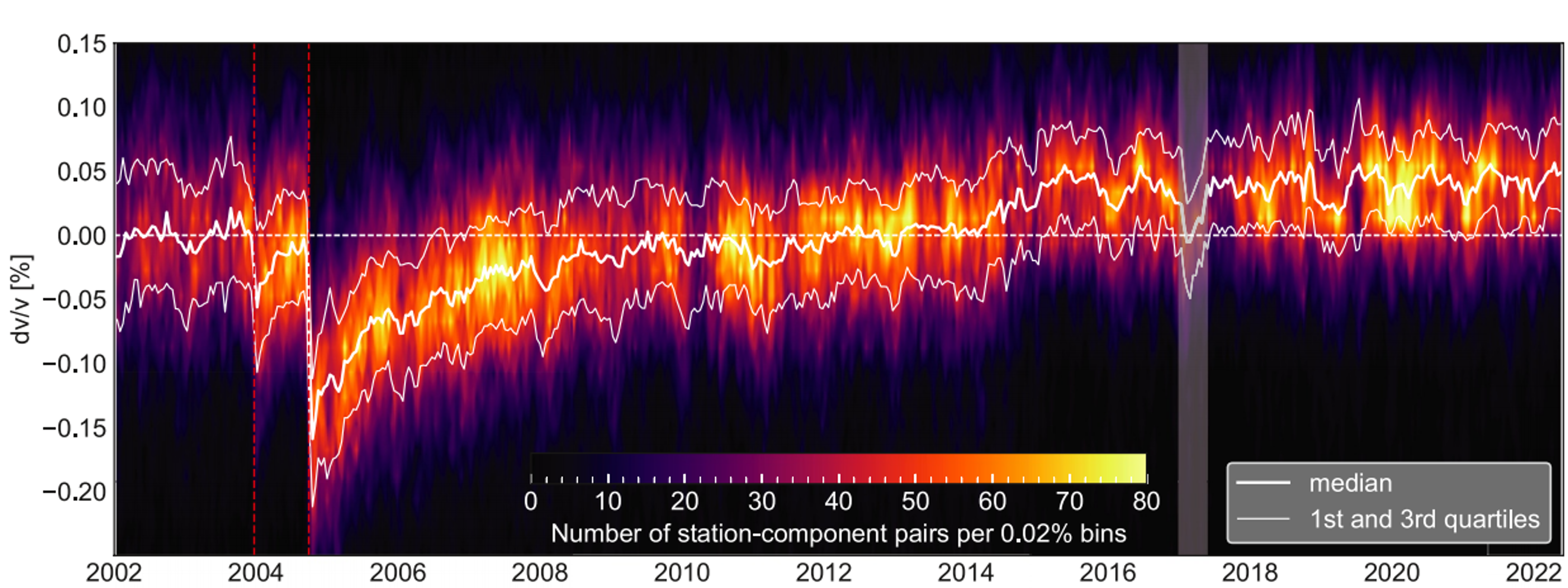 Background colormap shows how often a given dv/v value is observed in each time bin; the thick line is the median, and thin lines mark the quartiles. The San Simeon (SS) and Parkfield (PF) earthquakes (red dashed lines) reduce seismic velocity, followed by a slow recovery over months to years – echoing the slow dynamics seen in the lab. Gray shading marks a period affected by clock drift. Adapted from Okubo et al. (2024).