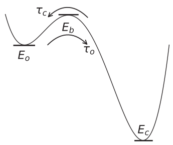 $$ \tau_o = A \\, e^{(E_b - E_o)/(k_B T)}, \quad \tau_c = A \\, e^{(E_b - E_c)/(k_B T)}. $$